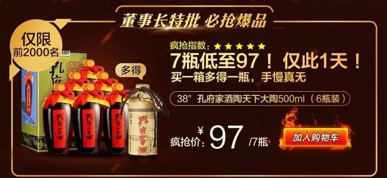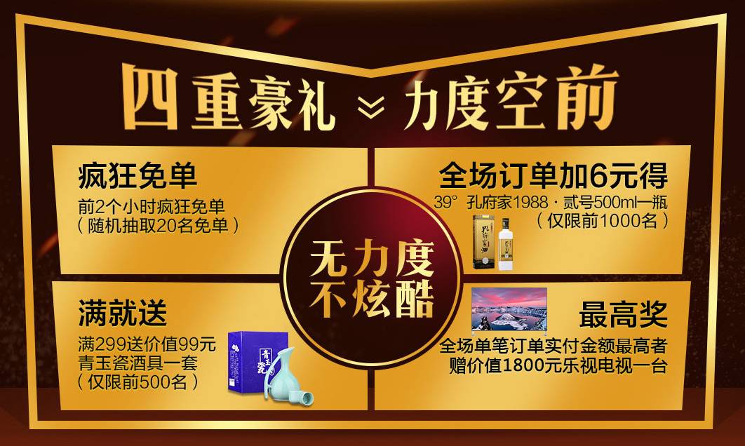 炫酷品牌日孔府家酒特卖日节后放价的力度不止于此,更是有董事长特批的必抢爆品38°孔府家酒陶天下大陶500ml(6瓶装),疯抢价仅需97元,此款酒为酒仙网最畅销的爆款口粮酒之一,每年销售30多万瓶,买一箱即多得一瓶38°孔府家精品简装酒450ml的福利;以自家私酿的美酒招待远方来的客人,正所谓“有朋自远方来,不亦乐乎”,52°孔府家酒·朋自远方1000ml升级版,得到厂家特批,疯抢价159元/套,买一套再得一瓶价值99元1000ml大容量的裸瓶朋自远方酒品;有酒友醉爱的爆款52°孔府家酒窖藏珍品1500ml大陶坛、年份老酒52°孔府家酒府藏贵宾500ml等等一系列的秒杀酒品等着你!悄悄告诉你在活动当日,单笔订单实付金额最高者奖励乐视电视一台哦!