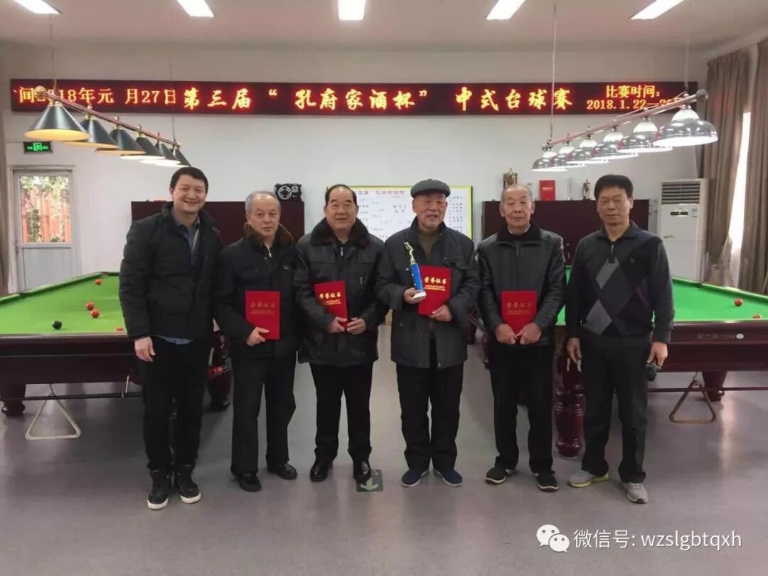 温州市老干部活动中心主办,孔府家酒温州总代理赞助,温州市老干部台球协会承办温州市老干部第三届“孔府家酒杯”中式台球赛,经过五天五轮激烈竞技于二O一八年元月二十六日里圆满落幕。荣获冠军的是82岁离休干部林雪生先生,荣获亚军的是许家宁先生,荣获季军的是苏风仪先,荣获第四名的是王华一先生。