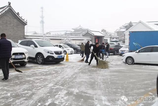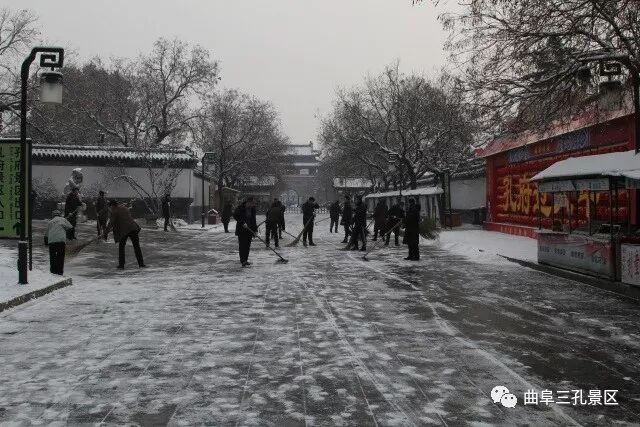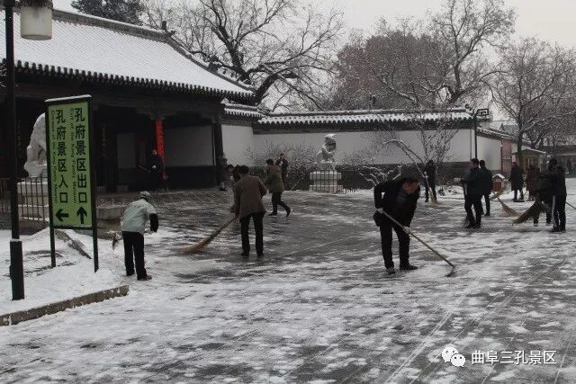为确保游客安全,28日一早景区工作人员冒着严寒,打扫积雪,用自己最朴素的方式表达着三孔景区最真挚的服务热情。最美的不是下雪天,是你们在风雪中忙碌的身影!