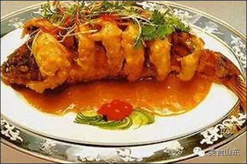 孔府的鲤鱼菜,渊源已久,而且还有专用的盛鱼器皿。此菜是用大小各一的鲜鲤鱼经红烧而成。小鱼面向大鱼怀中,分放两格的“鱼船”中。孔子的儿子孔鲤,其墓葬在孔子墓的前面,成为“抱子携孙”的墓葬布局的格式。“怀抱鲤”即由此得名。
