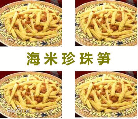 2、香油烧5成热时,炸姜末,烹料酒,放入海米、珍珠笋、高汤、精盐,颠炒装盘即成!