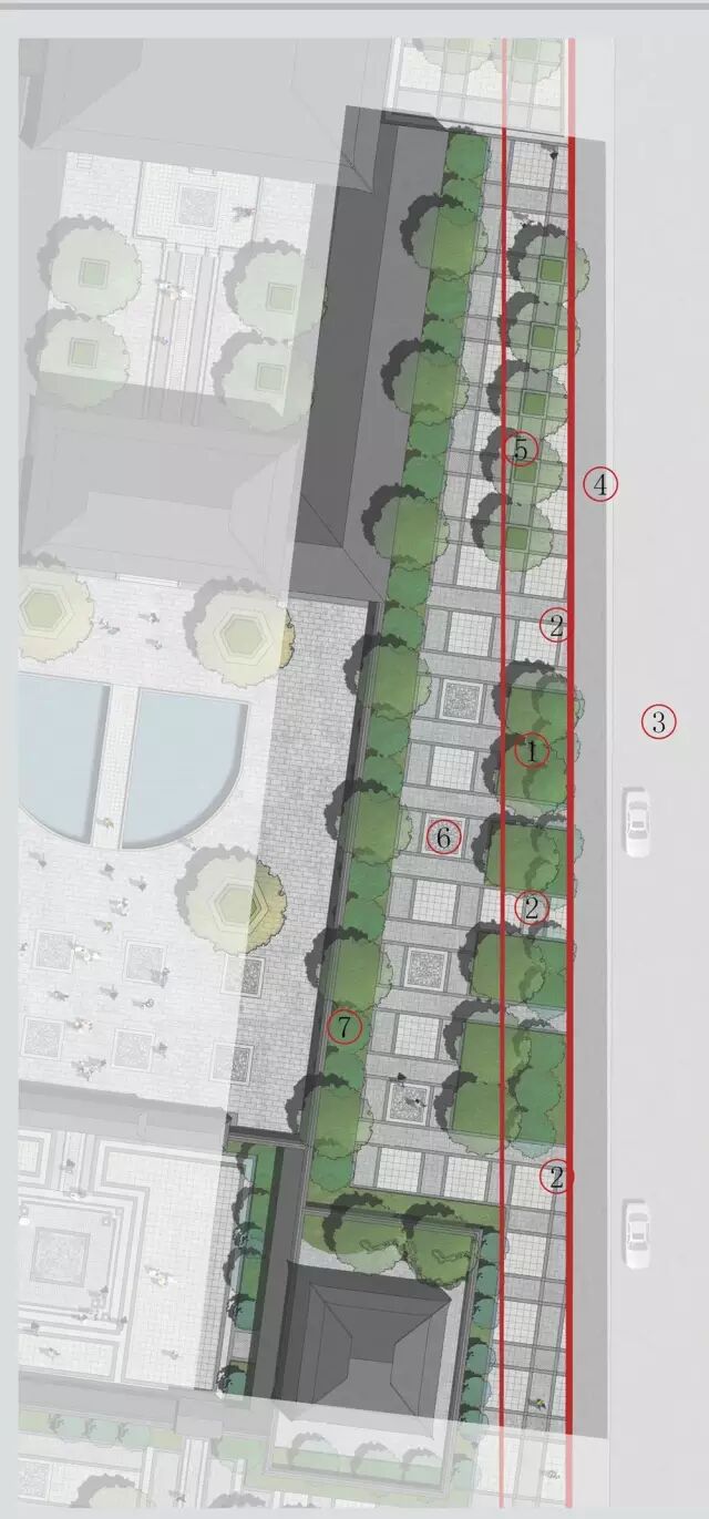 街边绿化区作为道路与整个景观区块的过渡区域,增加绿色空间,体现城市文化特色,为市民提供一个充满活力、人文情调的街头绿地景观氛围。