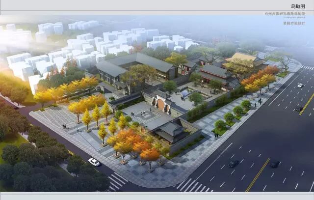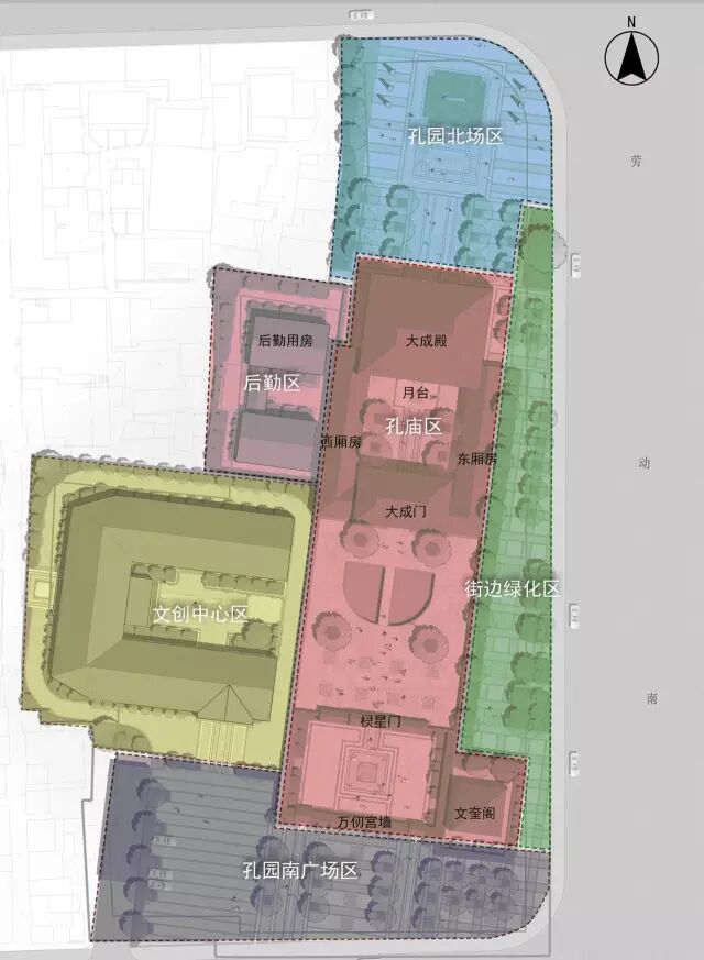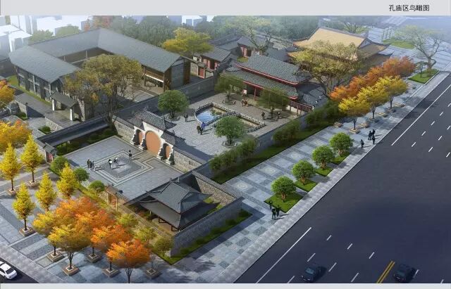 孔庙南北两侧用地作为集散广场,南侧设置地面停车位和地下停车场出入口。孔庙西侧用地作为民俗活动中心。