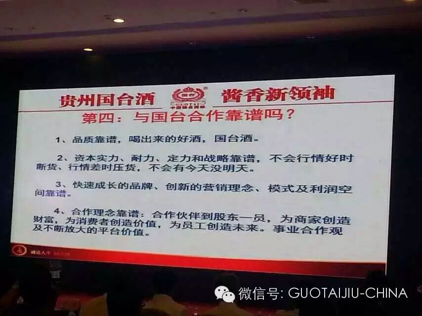 贵州国台酒业有限公司,是我国现代中药领军企业——天士力(600535)控股集团在贵州省茅台镇精心打造的现代化大型优质酱香型白酒企业,现已发展成为行业认可、政府授牌、社会公认的“茅台镇第二大酿酒企业”。国台品牌先后荣获“布鲁塞尔国际金奖”、“贵州省名牌产品”、“贵州省著名商标”、“贵州十大名酒”、“中国驰名商标”等荣誉称号,是中国酱酒领域当之无愧的主流品牌。