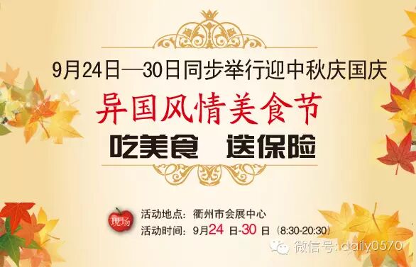 积分宝异国风情美食节 9月24-30日:积分宝异国风情美食节(室外平台)正在进行,本届的衢州异国风情美食节现场有近50个美食品类,包含了东南亚、欧洲、国内等众多老百姓爱吃的名品,从24日至30日,主办方还会邀请衢州最美好声音人气歌手到现场一展歌喉,不但能欣赏到衢州好声音学员的精彩表演,还能来一场舌尖上的艳遇。