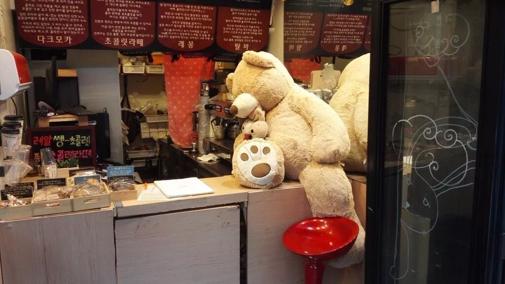 学校大门口对面的小咖啡厅,一只熊宝宝坐在柜台上,憨态可掬,每次看到它都想乐~~