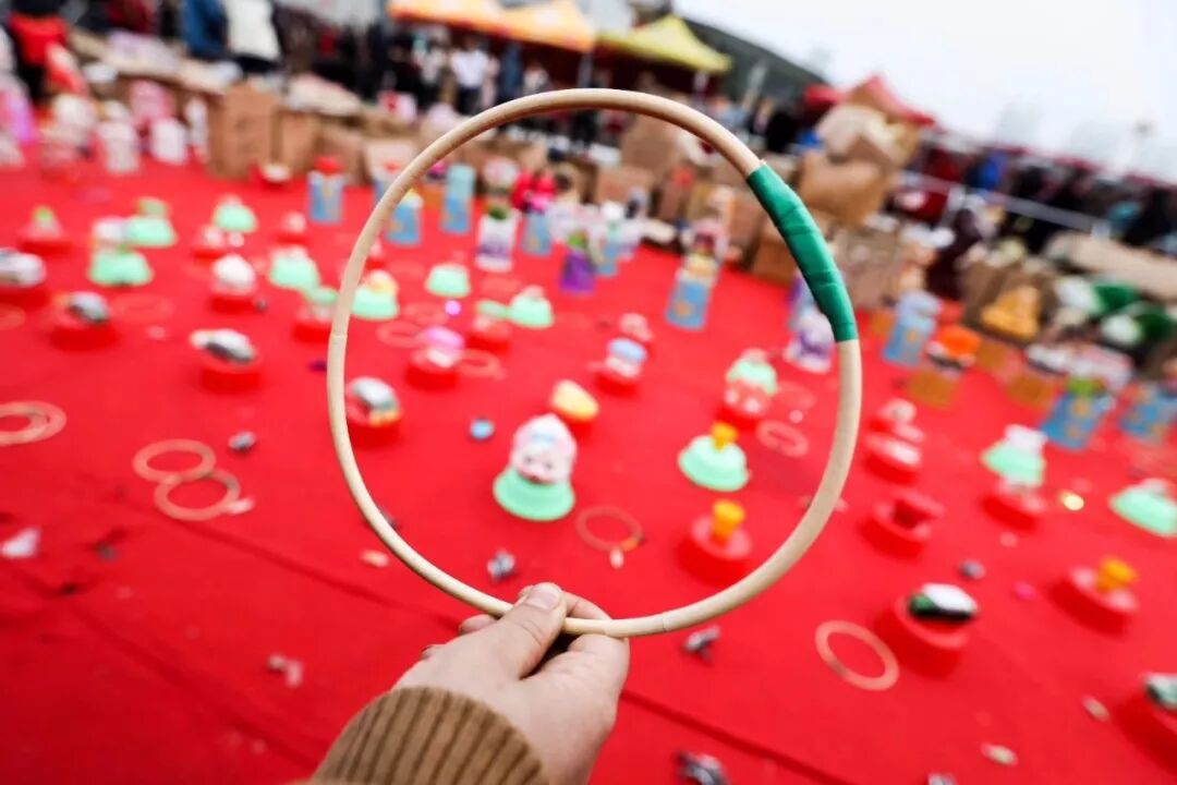 春节期间,文化广场附近,各种套圈游戏吸引着孩子们的兴趣。“10块钱33个圈,而且很多陶瓷摆件挺好看的,孩子也喜欢,就想让她亲手套上。”在一旁带着女儿玩的黄女士说,她是80后,小时候父亲带着自己也这样玩,现在轮到自己带着女儿出来,感觉很奇妙。“这个游戏记录了我的童年,现在又成了我女儿童年的美好记忆。我们那一代人就在这样的传统游戏里长大了,现在玩起来就像回到了小时候。”
