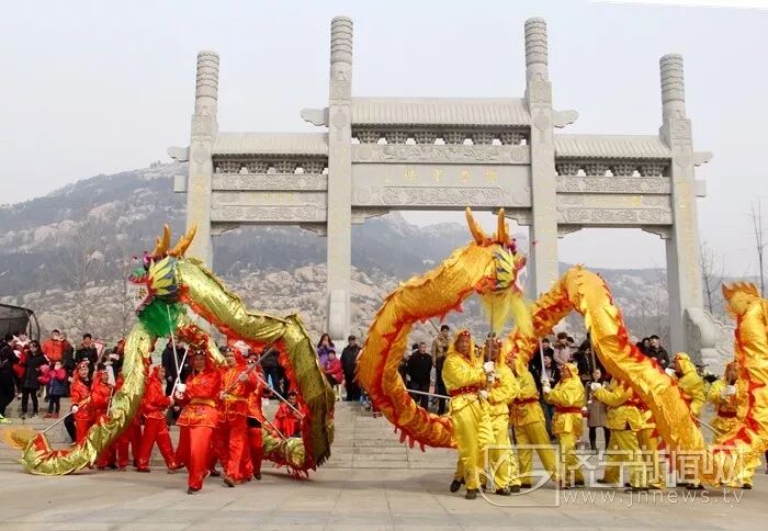 邹城峄山风景区2018年新春庙会期间举行了新春祈福、民俗展演、“登上峄山 石来运转”拍照留念领红包和门票优惠赢现金大奖等活动。各地游客纷至沓来,在峄山脚下敲锣打鼓,舞龙舞狮,登山峄山之巅敲钟祈福,文明时尚过年,春节假日旅游期间迎来开门红。图为山下民间艺术团舞龙现场。