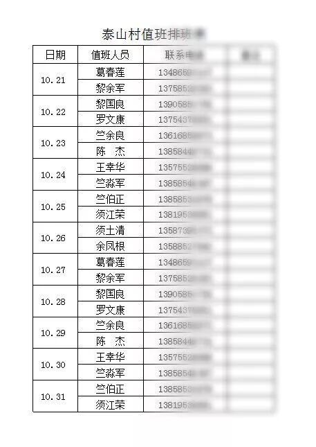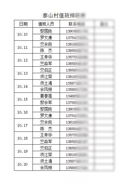 为护航,泰山村排定从10.10—10.31的24小时值班表,确保村办公室内每天至少有两人在岗。