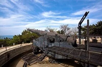旗顶山炮台位于刘公岛制高点的旗顶山上,海拔153.5米,1890年建成,分地下掩体和地上炮位两部分,共有24厘米口径的平射炮4门,炮台南侧崖劈建兵舍与弹药库。最顶端的大炮,虎虎生威。大炮是克虏伯公司生产的,跑长840厘米,有效射程6000米,炮口最大仰角22度,俯角5度,可全周射击,是当时先进的后膛来复线海防大炮。向远处看去,尽收眼底,在当时还是很有攻击性的。