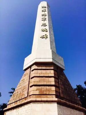 北洋海军忠魂碑在威海城区东部,刘公岛北洋海军提督署北山冈上。1988年,威海市人民政府为纪念清代北洋海军成军一百周年(1888~1988年)而建,故名。1989年5月落成。碑呈六棱形,高30米。碑身两侧凿有浮雕。碑座由石岛红花岗石砌成,碑身由莱州白色大理石贴面。由仇志海等人设计。戚其章撰文。碑文简述了北洋海军成军及中日甲午战争始末。碑矗立于松林之中,远望仿佛一柄巨剑刺向蓝天,象征着中华民族保卫祖国,反抗侵略的勇气和决心。