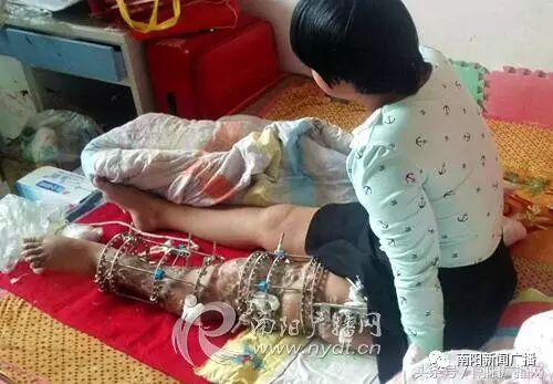 下图中的小女孩叫孔令鑫,她左腿上数十根钢钉,如果不及时入院治疗,可能面临截肢的危险