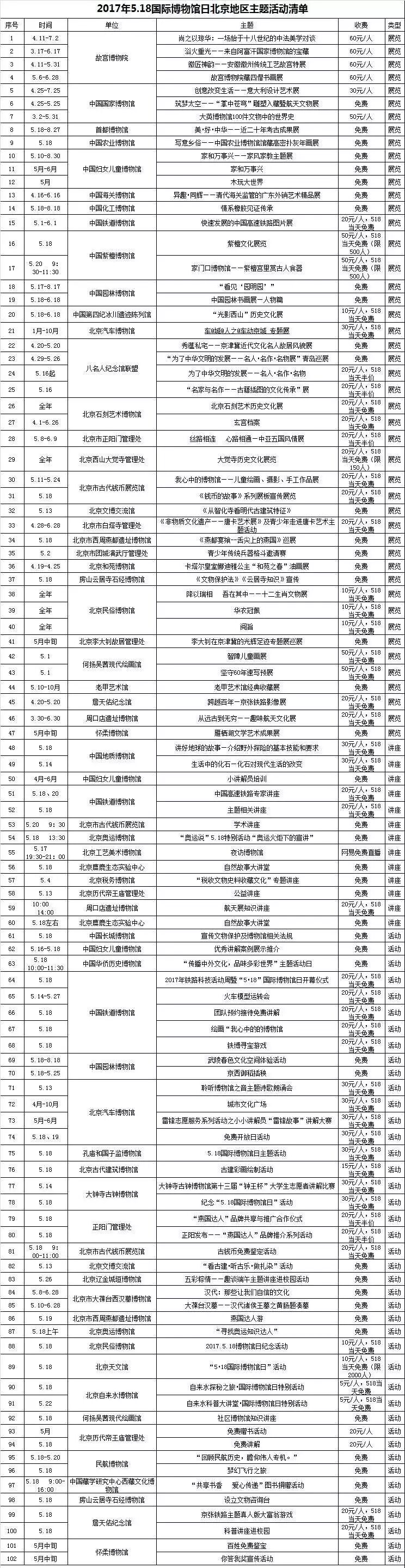 目前,北京地区各种类型的注册登记博物馆已有179家。5月18日对市民免费开放的博物馆多达97家,其中包括国有及非国有博物馆,覆盖面遍及整个北京城。全市多家博物馆根据自身资源特点,策划了多项精彩的展览和活动。据不完全统计,2017年“5.18国际博物馆日”北京地区博物馆共开展了102项主题活动(其中包括47项展览、13项讲座、42项活动。)