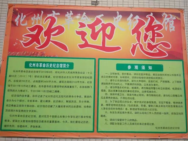 化州市建立革命历史纪念馆目的是为了铭记历史,缅怀先烈,珍爱和平,开创未来。革命历史纪念馆位于鉴江区德育学校,总投资700多万元,占地面积900多平方米,建筑面积2800多平方米,广场面积4800多平方米。纪念馆分“辛亥革命”、“星火燎原”、“抗日烽火”、“解放洪流”、“烈士丰碑”、“老区奉献”和“领导干部功勋”7个展区。通过大量革命遗物、历史照片、文字资料等形式真实反映化州市的革命历史。