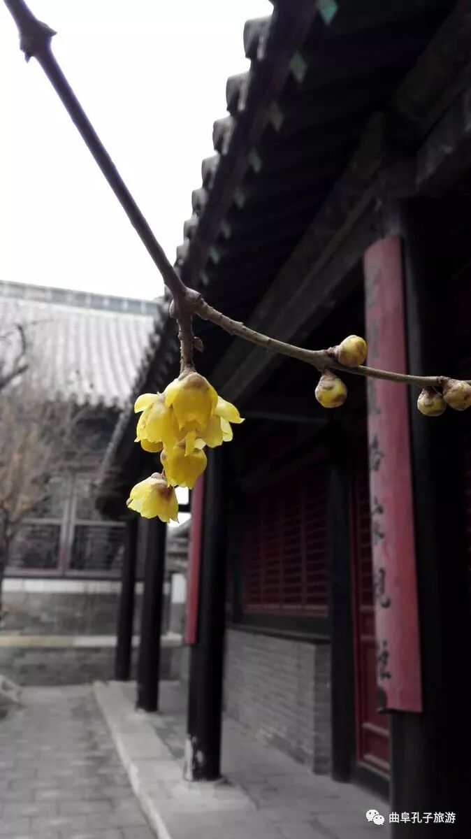 在曲阜孔府忠恕堂前的一棵具有四百年树龄的腊梅近日迎春绽放,金黄色的花苞缀满枝头,吐芳纳翠,娇艳欲滴,簇簇花朵在风中婀娜摇曳,散发着阵阵沁人心脾的清香。