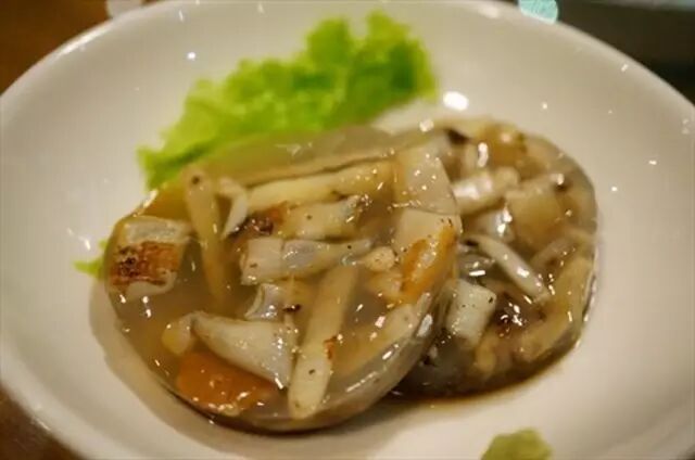 当当当,下面隆重推荐——土笋冻!!等一下,等一下,为什么这冻里面没有笋呢?当地的商家说,这土笋可不是笋,而是生长在河口滩涂上的一种蠕虫,学名可口革囊星虫,含有丰富的胶质。经过熬煮,胶质溶入水中,冷却后即凝结成块状,其肉清,味美甘鲜。再配上好酱油、永春陈醋、蒜蓉,就成为了一道可口的小吃。话说浙小编最爱的就是它的那股嚼劲。
