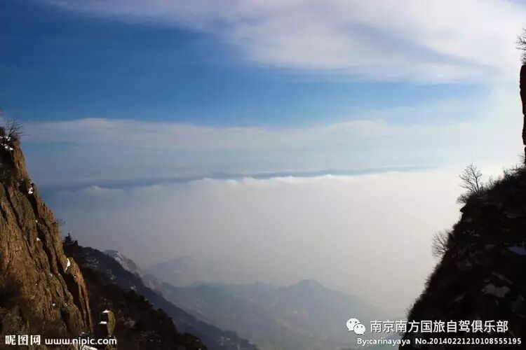 2、云海玉盘----泰山云雾可谓呼风唤雨,变换无穷:时而山风呼啸,云雾弥漫,如坠混沌世界;俄顷黑云压城,地底兴雷,让人魂魄震动,游人遇此,无须失望,因为你将要见到云海玉盘的奇景:有时白云滚滚,如浪似雪;有时乌云翻腾,形同翻江倒海;有时白云一片,宛如千里棉絮;有时云朵填谷壑,又象连绵无垠的汪洋大海,而那座座峰峦恰似海中仙岛。站在岱顶,俯瞰下界,可见片片白云与滚滚乌云而融为一体,汇成滔滔奔流的“大海”,妙趣横生,又令人心朝起伏。