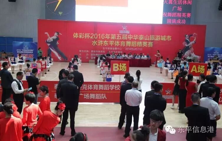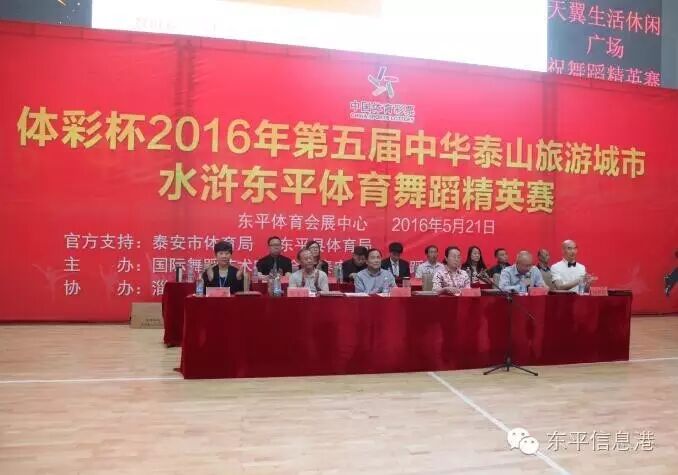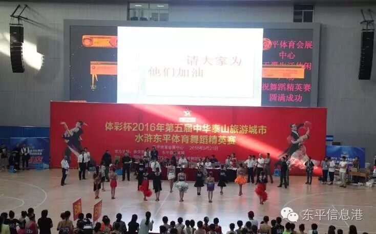 2016年5月21日由泰安市体育局、东平县体育局支持,国际舞蹈艺术家协会主办,泰安市体育舞蹈协会承办,各企业和体育舞蹈俱乐部协办的“体彩杯”2016年第五届中华泰山旅游城市水浒东平体育舞蹈精英赛在东平县体育馆圆满举行,本届比赛有来自秦皇岛、德州、济南、济宁、枣庄、淄博、潍坊、菏泽、泰安、新泰、肥城、宁阳、东平等等一千多选手参赛。