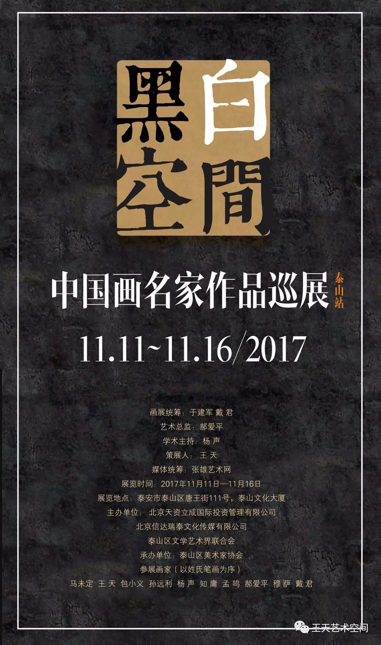 为庆祝的胜利召开,弘扬中华传统文化,由北京天资立成国际投资管理有限公司、北京信达瑞泰文化传媒有限公司,泰安市泰山区文学艺术界联合会主办,泰山区美术家协会承办的黑白空间---中国画名家作品巡展(泰山站)将于2017年11月11日—11月16日期间在泰山文化大厦盛大举行。画展将集中展示10位当代实力派中国画名家的新创作、新成就100幅,对推动泰安市美术事业持续繁荣发展所呈现出的人文价值与学术关怀有着特殊的意义,通过这个展览以期拓展、锐化美术作品对当代生活进行艺术诠释的眼界与锋芒。