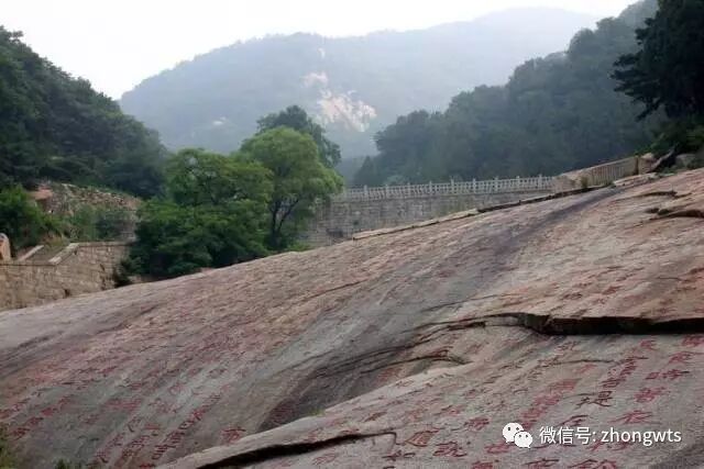 经石峪位于泰山斗母宫东北,有岔路盘道相通,过漱玉桥、高山流水亭、神聆桥即至。峪中有缓坡石坪,上刻隶书《》,是我国现存规模最大的摩崖刻石。 经文刻于面积2064平方米的缓坡石坪上,自东而西刻《金刚般若波罗密经》,传为安道壹所书。
