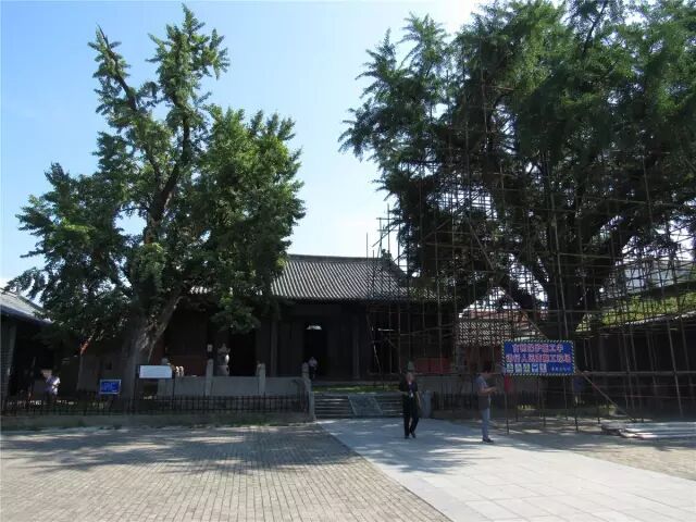 迈过戟门,视野一下子开阔了许多,眼前一片空旷。正对面庄严肃穆座立着大成殿,在大成殿的门前挺立着两棵千年银杏,枯黄的树干,苍劲有力,岁月在其身上留下难以忘却的皱纹,根部爬满了青苔,枯枝的尽头也在这深秋里尽力突出一抹绿,让我不由得深深倾佩她那顽强的生命力!