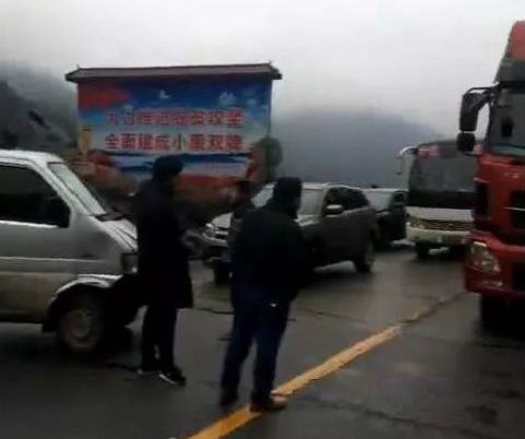 207国道双牌县大山路段,路侧有薄雪,路中无积雪冰渣,车辆靠中心缓慢行驶。
