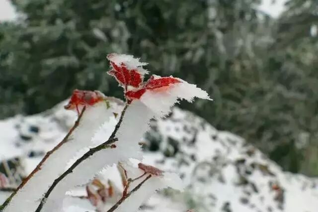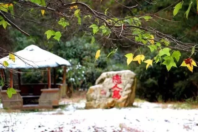 11月20日,阳明山降下了今冬第一场雪,小黄江源和北江冲的树林红叶秋色犹在,地面和屋顶却被覆上了一层皑皑白雪。