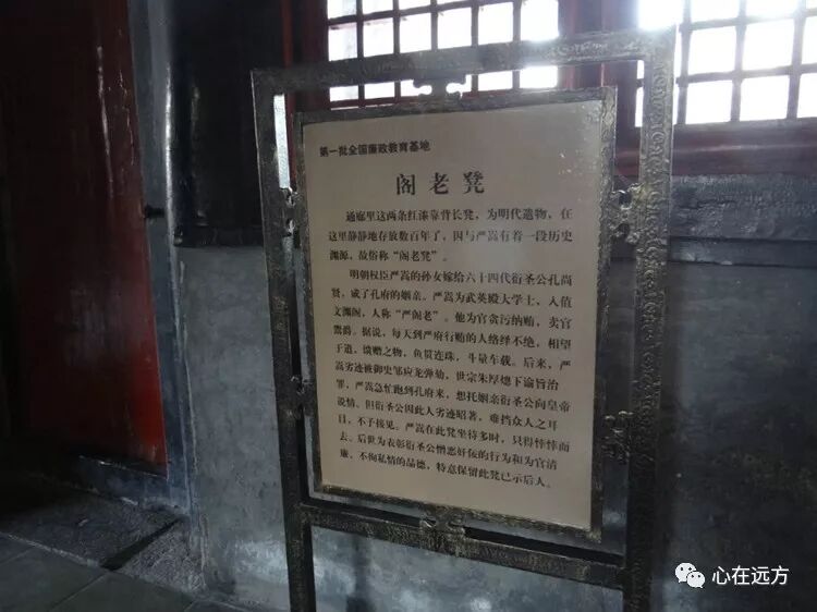 在孔府有个阁老凳,明朝的大奸臣严嵩将自己的孙女嫁给了孔子的某代孙子,因为严嵩犯下重罪,在他被降罪之前他来到孔府,想请孔家出面为他求情,但是孔家的办事人并没有让他进门,让他坐在外面的红凳子上等,孔家人最终也没见他。